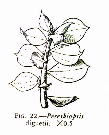 Growth Habits: Shrub, around 5 feet tall (1.5 m), reddish stems with woolly areoles; young hair white, turning black as it ages; few brown glochids; leaves 0.8 to 2.4 inches long (2 to 6 cm); 1 to 4 blackish spines, up to 3 inches long (7 cm)